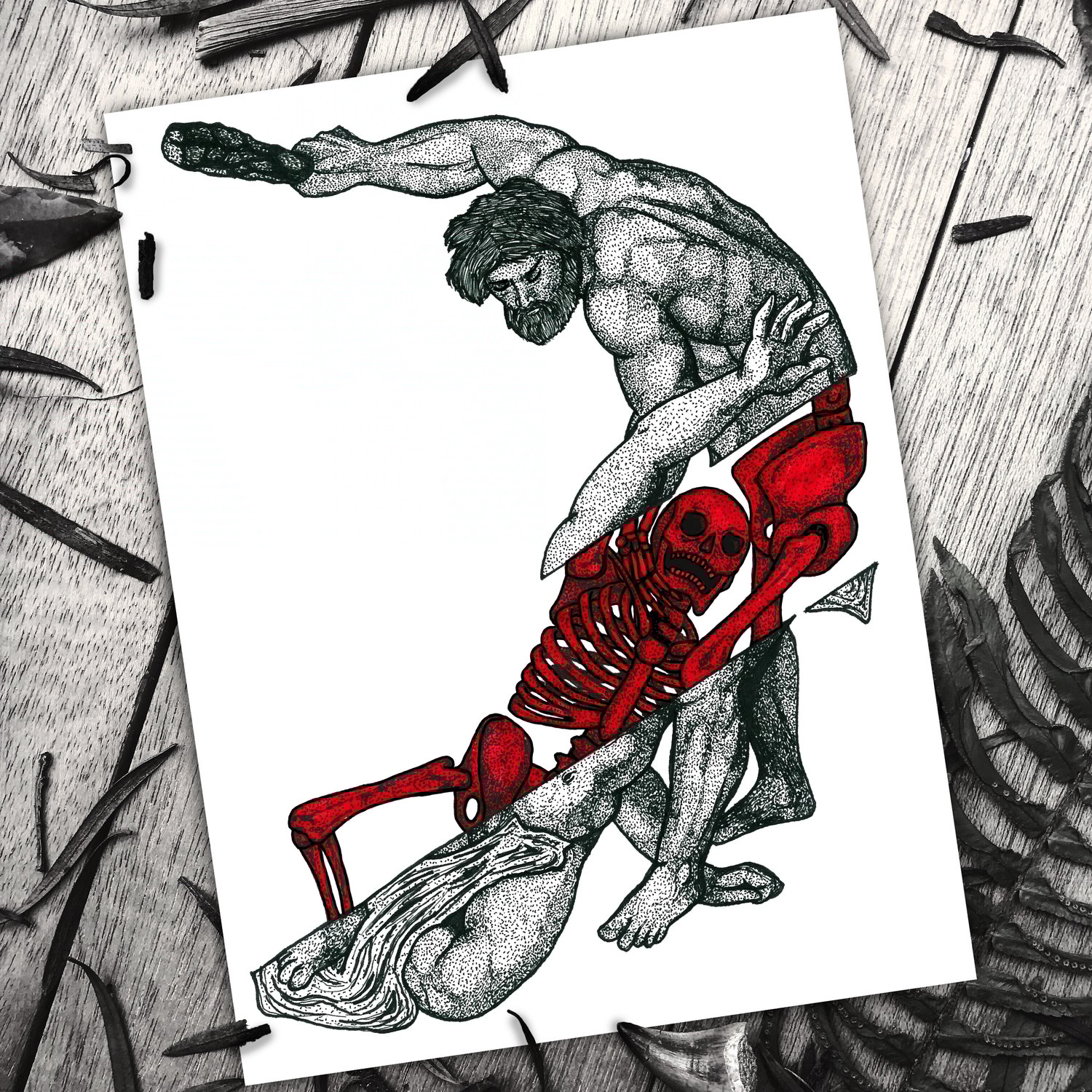 The story of Cain and Abel is one many know. The twisted figure of Abel is horrified looking up at his older brother, who is prepared to swing his club down at him.